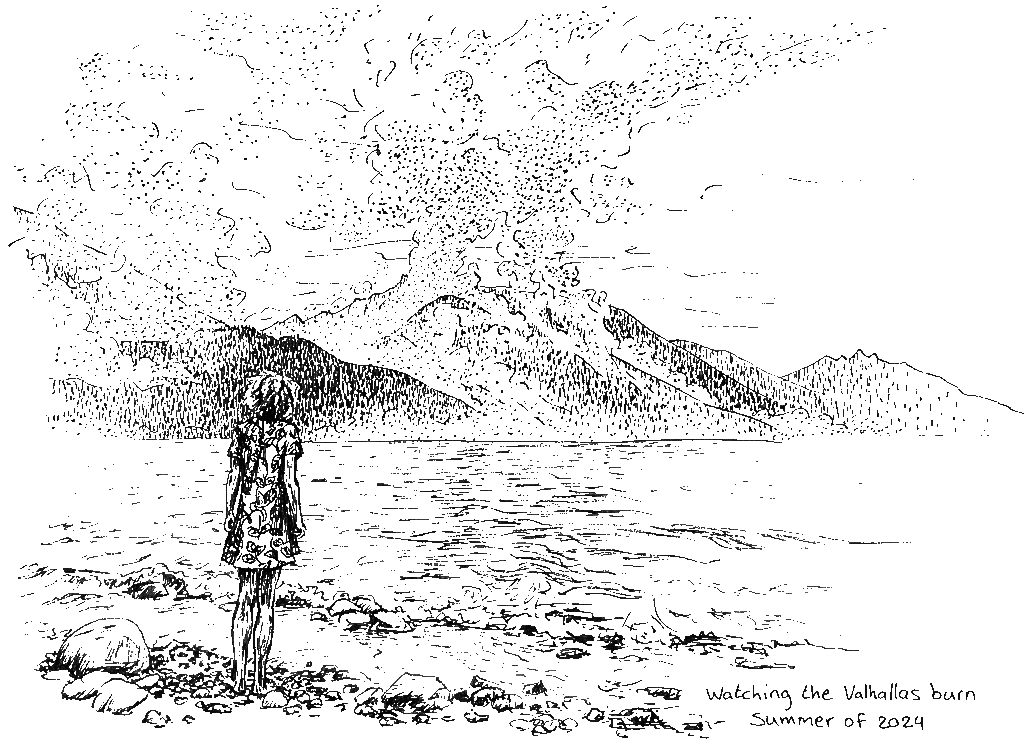 I am an visual artist and public space designer based out of New Denver, BC. I grew up in The Netherlands, where it is “as flat as a pancake” and fell in love with the wilderness, people, and mountains of the Slocan Valley as soon as I set foot here. I have never felt anywhere more at home than in New Denver and I deeply care for my community. Then came the Summer of 2024: As unreal as it seemed, I was watching the fires burn through our magical forests and threaten our rural communities. I experienced what it is like to evacuate knowing you may never see your home again, the incredible power of nature, the uncertainties, the hectics, the logistics, the lack of fresh air, people leaving and people coming to help, the connectiveness, but also isolation. These events made a lasting impression on me. It is not like a book that you finish and put away; wildfires and other natural disasters are part of our foreseeable future here. What does that mean, how does that feel? I have always processed my emotions through visual art, and I believe that art is an essential part of any healthy society. I feel it is my purpose to connect people through art. That is how this project about the sentiment of wildfires came to be. I hope it will help you reflect, process, learn and feel connected.